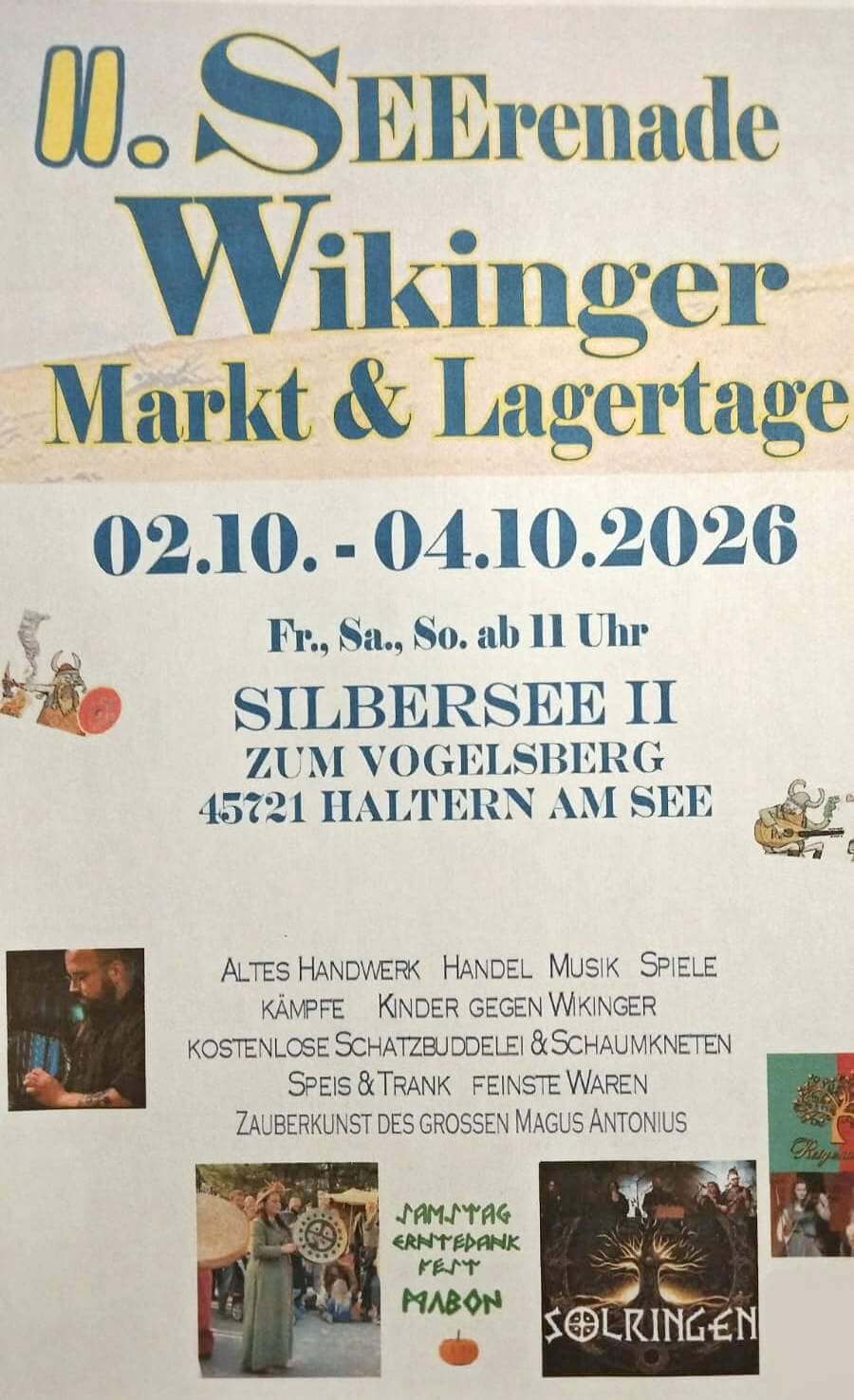 Der 11. SEErenade Wikinger Markt & Lagertage 2026 findet vom 02. bis 04. Oktober 2026 am Silbersee II in Haltern am See, Nordrhein-Westfalen, Deutschland, statt. An Freitag, Samstag und Sonntag ist der Markt jeweils ab 11 Uhr geöffnet und lädt Besucher für drei Tage zu einer besonderen Zeitreise direkt am See ein.