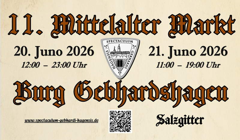 Das 11. Spectaculum gebhardi hagensis 2026 findet am 20. und 21. Juni 2026 auf der Burg Gebhardshagen in Salzgitter, Niedersachsen, Deutschland, statt und lädt Marktvolk, Familien und Gewandete zu zwei Tagen voller mittelalterlichem Leben ein. Die historischen Mauern der Burg öffnen sich bereits zum elften Mal für dieses besondere Mittelalterspektakel, das mit einem umfangreichen und abwechslungsreichen Programm aufwartet.