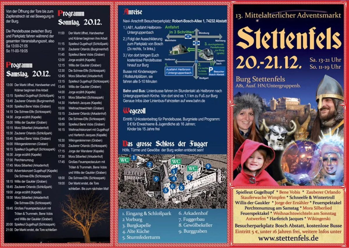 Am 20. und 21. Dezember 2025 verwandelt sich Burg Stettenfels in Untergruppenbach (Baden-Württemberg, Deutschland) in ein lebendiges Mittelalterdorf. Der 13. Mittelalterliche Adventsmarkt entführt Besucher in eine festliche Welt voller Gaukler, Spielleute und Rittersleut – und das kurz vor Weihnachten.