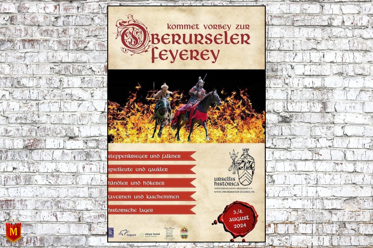 Das 14. Oberurseler Feyerey findet am 03. und 04. August 2024 in Oberursel statt. Machen Sie mit uns eine Zeitreise und tauchen Sie ein in eine Welt mit Spielleuten, Gauklern, Steppenreitern, Falknern, Kriegern und Vaganten. Handwerker und Hökerer bieten ihre Waren feil, und Tavernen sowie Schmaushäuser lassen bezüglich Speis und Trank kaum einen Wunsch offen. Hunderte Mitwirkende in ihren authentischen Gewändern vermitteln Groß und Klein die Vielfalt der mittelalterlichen Kultur und Gesellschaft.
