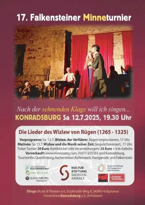 Am Samstag, den 12. Juli 2025, findet auf der historischen Konradsburg im Harzer Ortsteil Ermsleben das 17. Falkensteiner Minneturnier statt – ein ganz besonderes Musikereignis für Mittelalterfreunde.