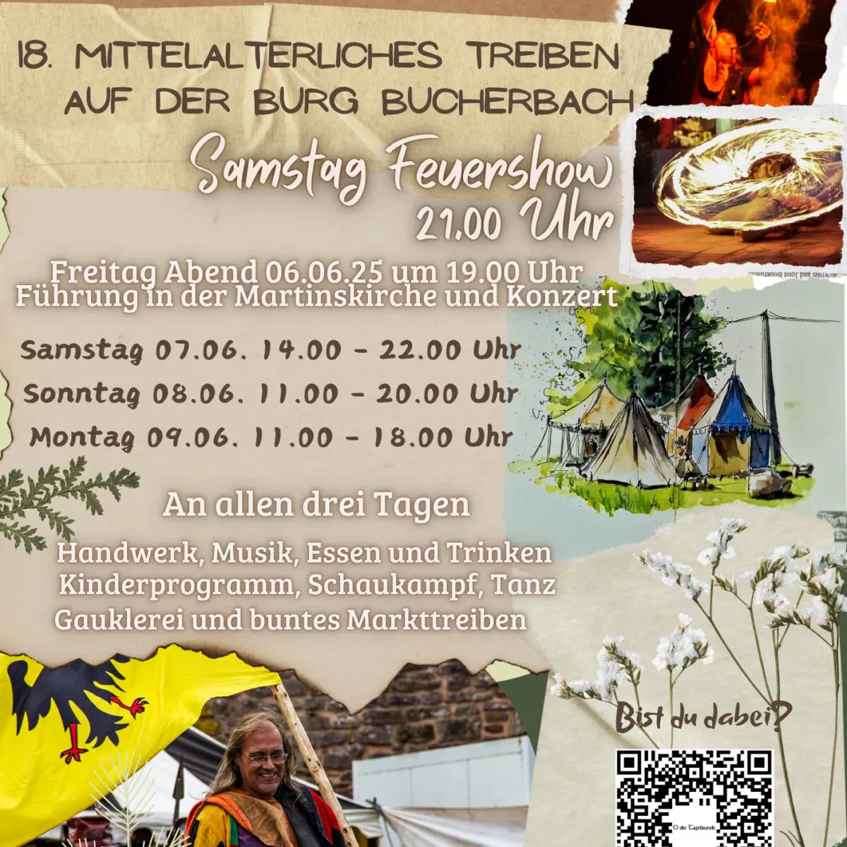 - Feuershow: Am Samstagabend, 07. Juni 2025, erhellt eine magische Feuershow den Hof der Burg. Beginn ist um 21:00 Uhr – ein absolutes Muss für alle Besucher!