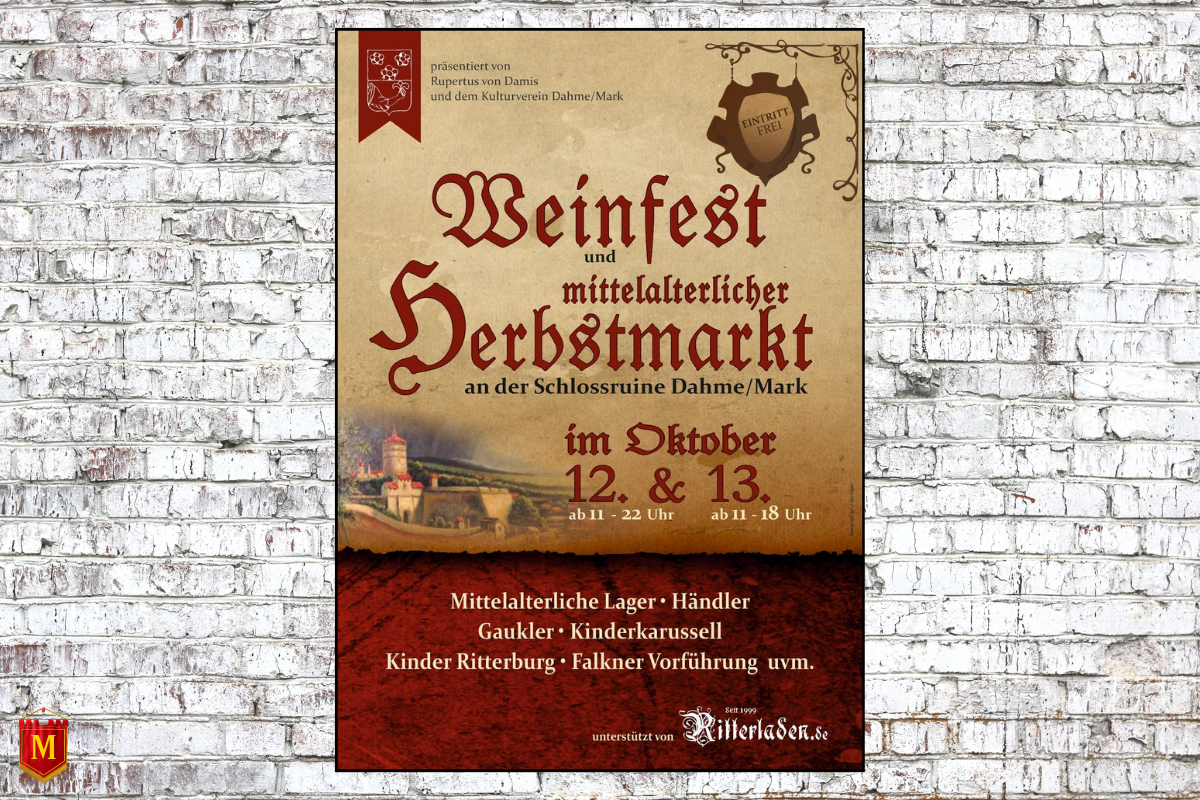 Am 12. und 13. Oktober 2024 findet der 2. Mittelalterliche Herbstmarkt und 3. Weinfest auf der Schlossruine in Dahme/Mark statt. Besucher sind eingeladen, in die Welt des Mittelalters einzutauchen und sich von zahlreichen Attraktionen wie mittelalterlichen Lagern, Händlern und Handwerkern verzaubern zu lassen. Das malerische Ambiente von Brandenburg bietet die perfekte Kulisse für ein Wochenende voller Erlebnisse.