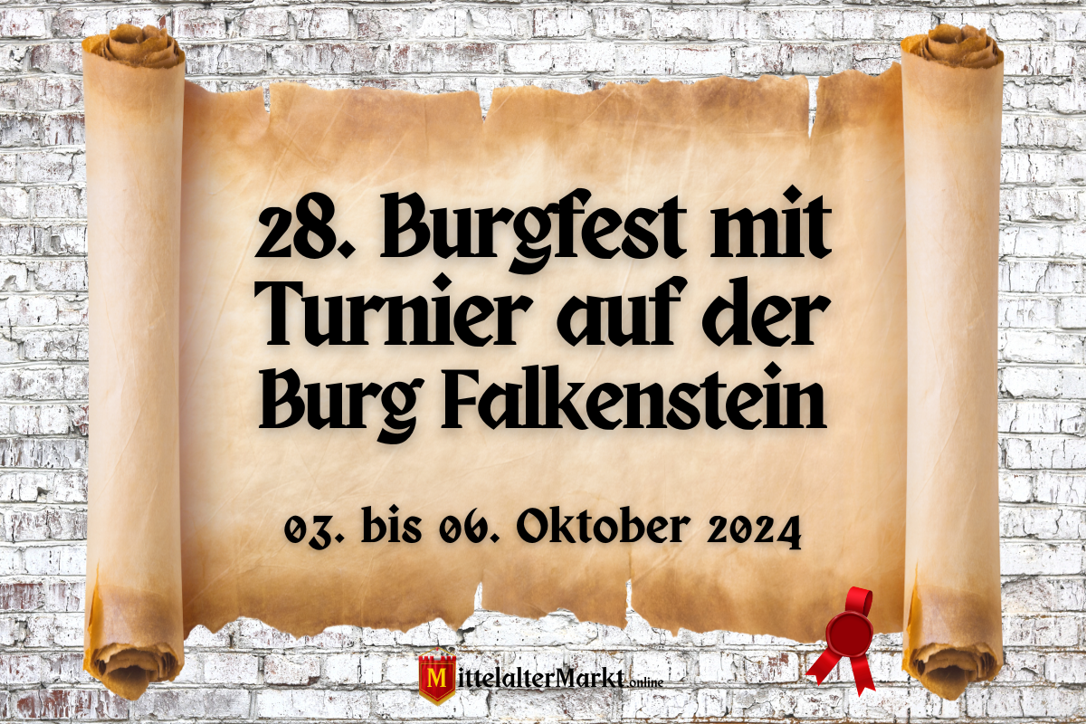 Das 28. Burgfest mit Turnier auf der Burg Falkenstein findet vom 03. bis 06. Oktober 2024 in Falkenstein (ST) statt. Besucher können sich auf ein authentisches Mittelalterfest freuen, das täglich von 10:00 bis 19:00 Uhr seine Tore öffnet.