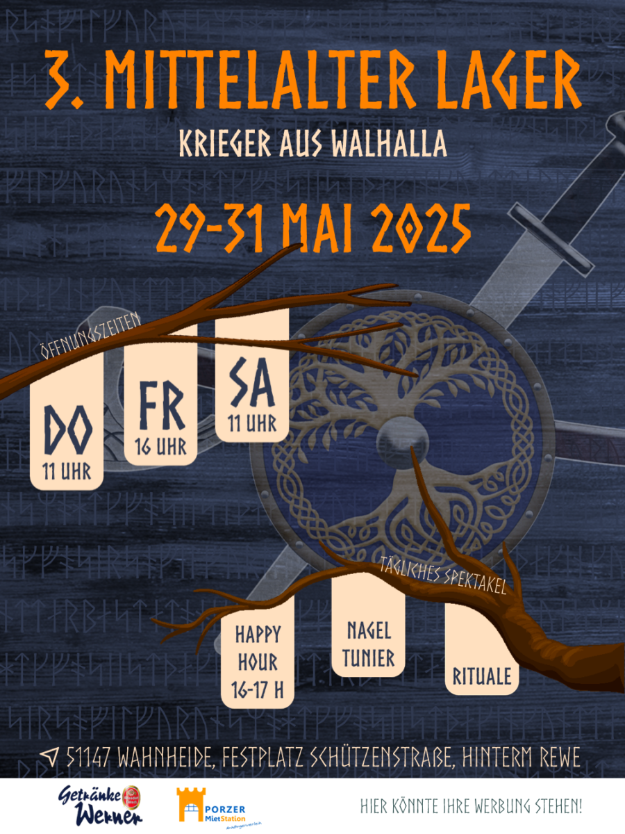 Vom 29. bis 31. Mai 2025 verwandelt sich der Festplatz Wahnheide in Köln in ein beeindruckendes Mittelalterlager. Die „Krieger aus Walhalla“ laden zu ihrem jährlichen Heerlager ein, das Geschichte, Brauchtum und Geselligkeit vereint.