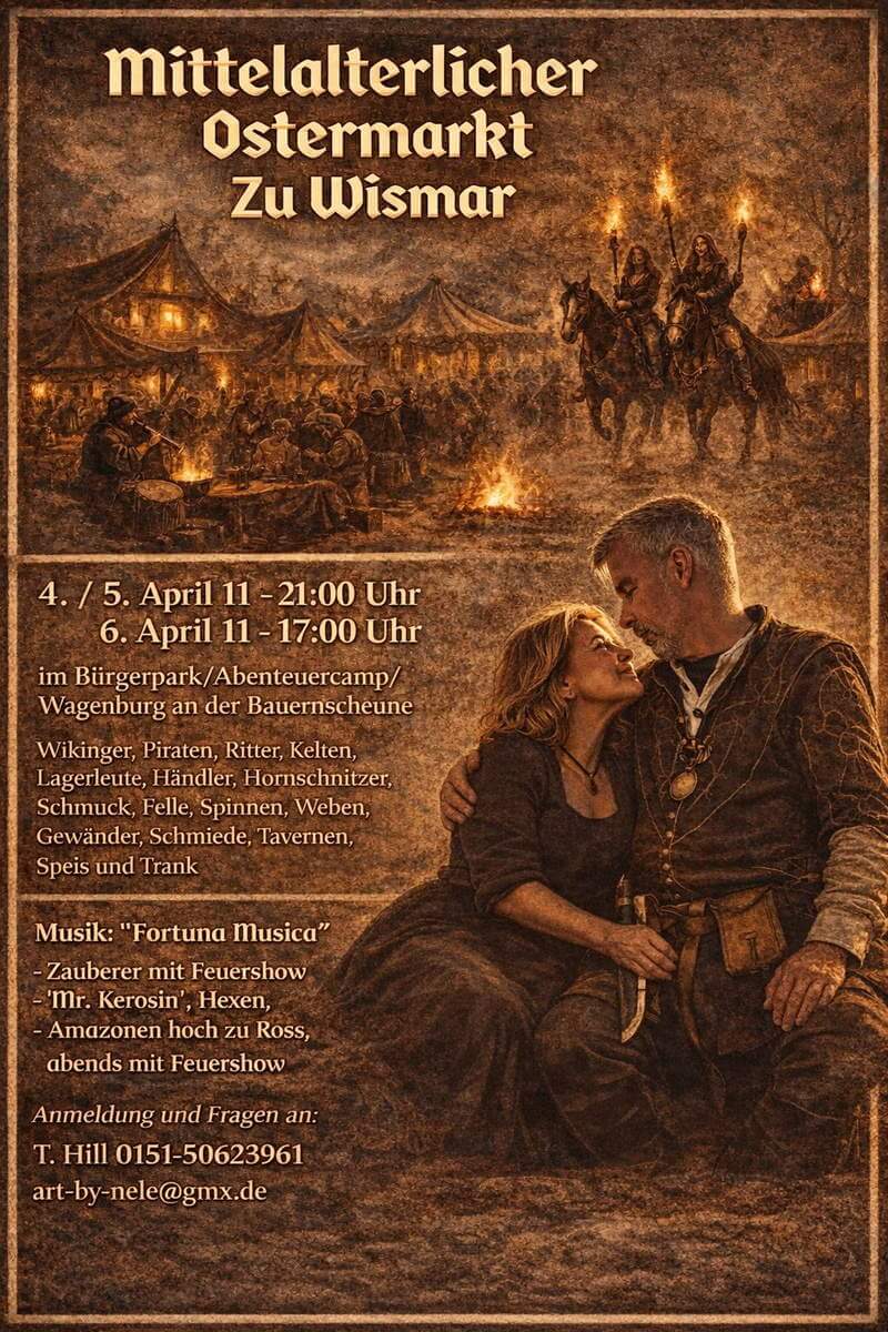 Der 4. Mittelalterliche Ostermarkt Wismar 2026 findet vom 04. bis 06. April 2026 im Bürgerpark, genauer im Abenteuercamp mit Wagenburg an der Bauernscheune, in Wismar, Mecklenburg-Vorpommern, Deutschland statt. An drei Tagen über Ostern wird das Gelände zum Treffpunkt für historische Darsteller, Handwerker und Marktleute.