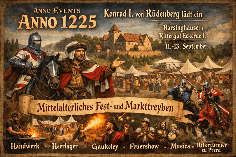 Das ANNO 1225 Barsinghausen 2026 findet vom 11. bis 13. September 2026 auf dem Rittergut Eckerde I in Barsinghausen, Niedersachsen, Deutschland statt. Das historische Gut, auch bekannt als Rittergut von Heimburg, bildet die eindrucksvolle Kulisse für ein großes Mittelalterfest mit Ritterturnier, Marktleben und abwechslungsreicher Unterhaltung.