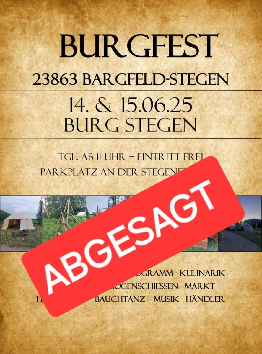 Das Burgfest Bargfeld-Stegen 2025 findet am 14. und 15. Juni auf der historischen Burganlage Burg Stegen in Bargfeld-Stegen (SH) statt. Dieses Mittelalterfest bietet ein abwechslungsreiches Wochenende voller Aktivitäten und historischer Erlebnisse. Der Eintritt ist frei, und Parkplätze stehen in der Stegener Allee zur Verfügung.