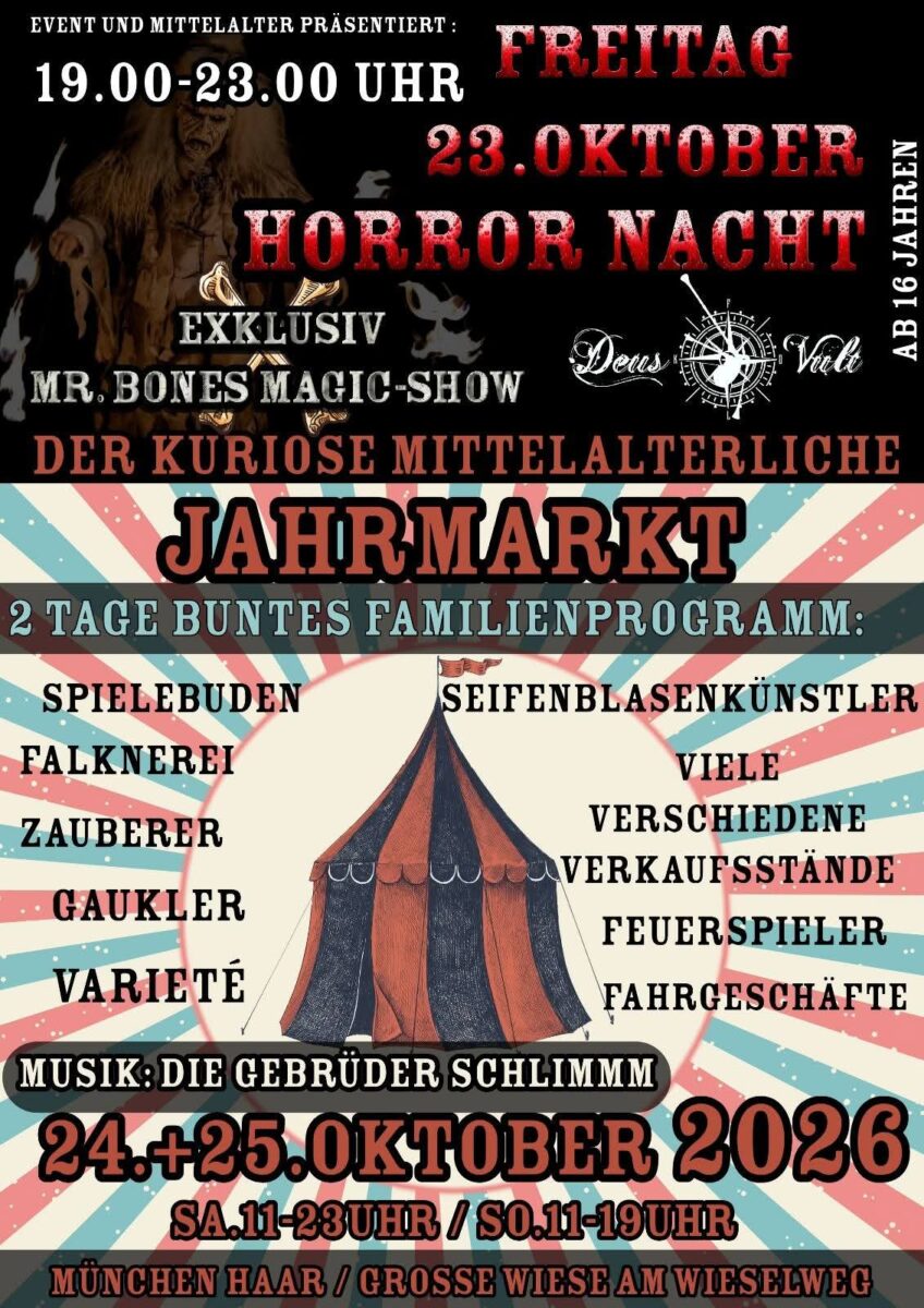 Vom 23. bis 25. Oktober 2026 wird es auf der Großen Wiese am Wieselweg in Haar, Bayern, alles andere als gewöhnlich: „Der Kuriose Mittelalterliche Jahrmarkt“ lädt zu einem bunten Spektakel ein, das mit Fantasie, skurrilen Gestalten und einer ordentlichen Portion Mittelalter überrascht. Hier erwartet dich ein Wochenende voller Musik, Artistik und Abenteuer für Groß und Klein – mit einem besonderen Extra am Freitagabend.