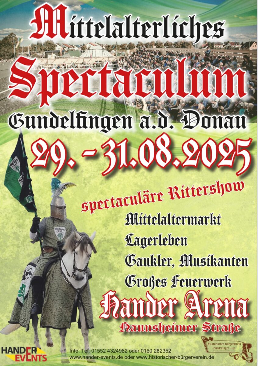 Vom 29. bis 31. August 2025 verwandelt sich die Hander Arena in Gundelfingen an der Donau (Bayern) in eine mittelalterliche Erlebniswelt. Beim Gundelfinger Ritterturnier 2025 erwarten die Besucher spektakuläre Kämpfe, Musik, Handwerk und ein buntes Marktgeschehen – ein unvergessliches Fest für die ganze Familie.
