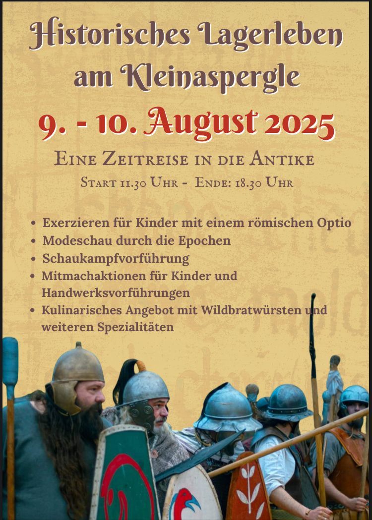 Am 9. und 10. August 2025 wird das Kleinaspergle bei Asperg (Baden-Württemberg) zum Schauplatz eines ganz besonderen Spektakels: Das Historische Lagerleben am Kleinaspergle entführt seine Gäste unter dem Motto „Eine Zeitreise in die Antike“ in vergangene Zeiten voller Abenteuer, Bildung und familiärer Unterhaltung.