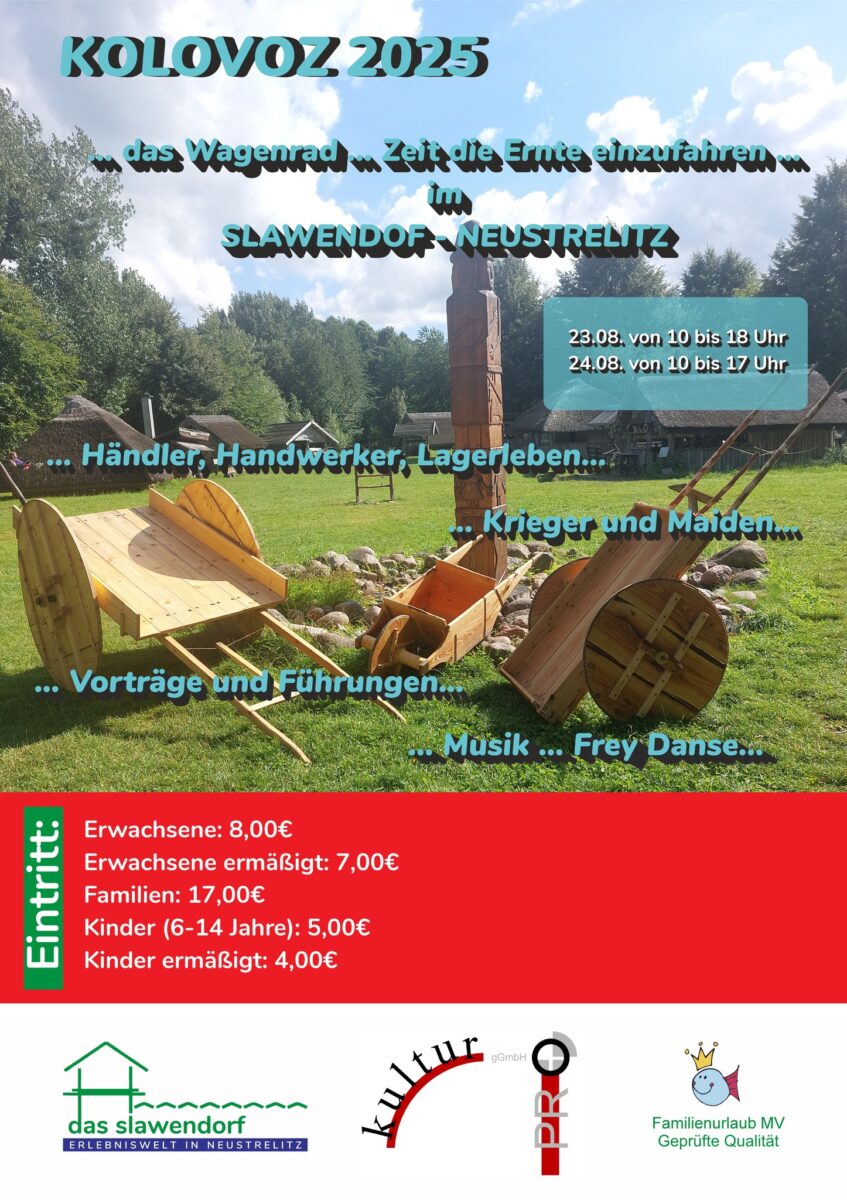 Am 23. und 24. August 2025 erwacht das Slawendorf Neustrelitz erneut zum Leben: Mit dem historischen Fest Kolovoz 2025 kehrt die Welt der Slawen zurück – voller Lagerleben, Handwerk, Musik und alter Bräuche. Unter dem Motto „… das Wagenrad … Zeit die Ernte einzufahren …“ erwartet Besucher ein Wochenende voller Eindrücke, Erlebnisse und Entdeckungen.