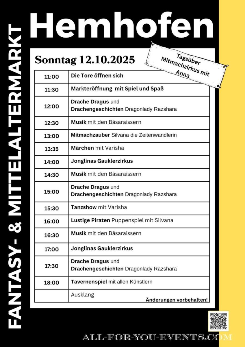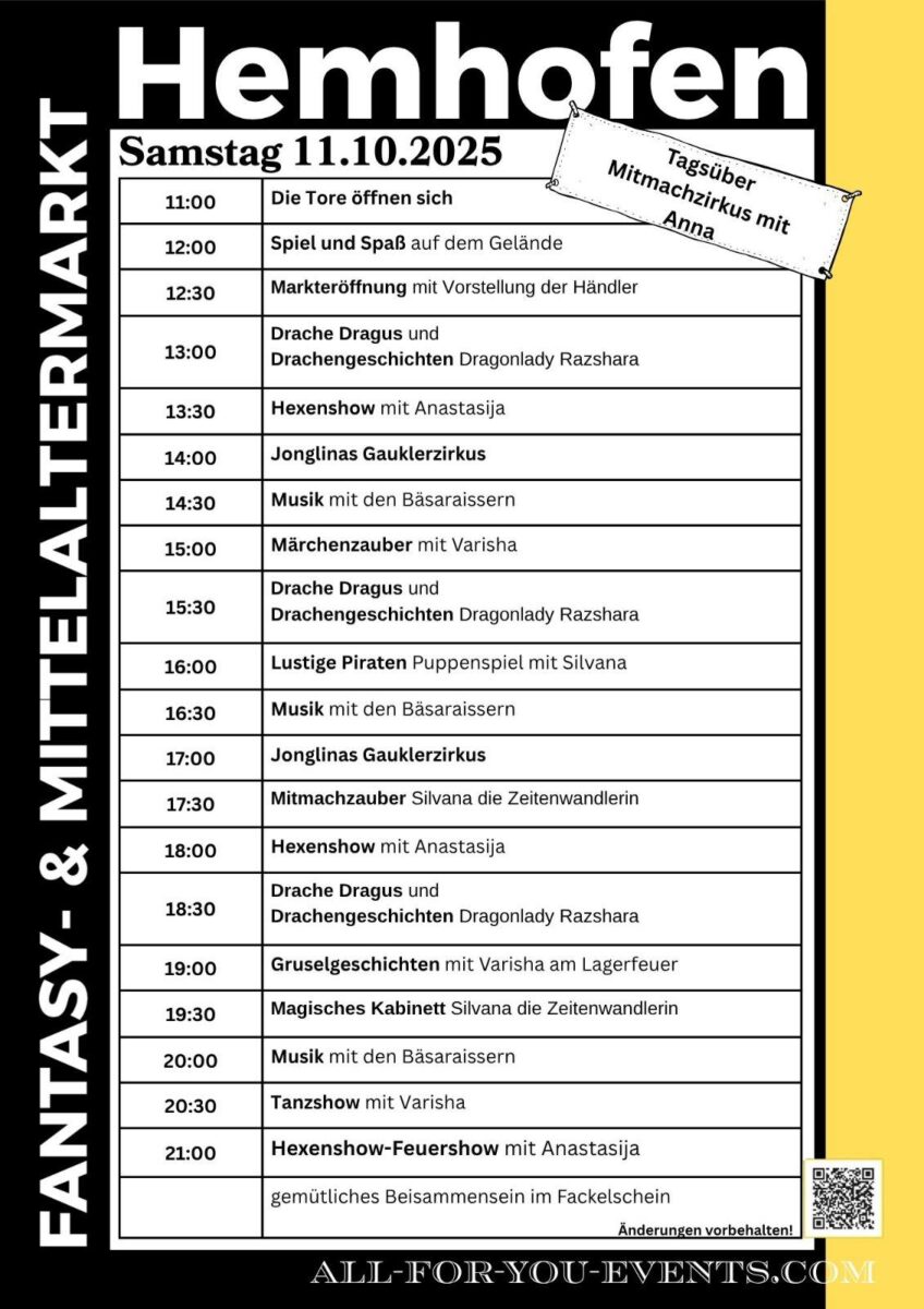 Am 11. und 12. Oktober 2025 verwandelt sich Hemhofen in ein Reich voller Ritter, Märchenwesen und Magie. Beim Mittelalter & Fantasy Markt Hemhofen erwartet Besucher*innen ein Wochenende, das Geschichte und Fantasie auf einzigartige Weise verbindet – mit Shows, Kämpfen, Handwerk und kulinarischen Genüssen.