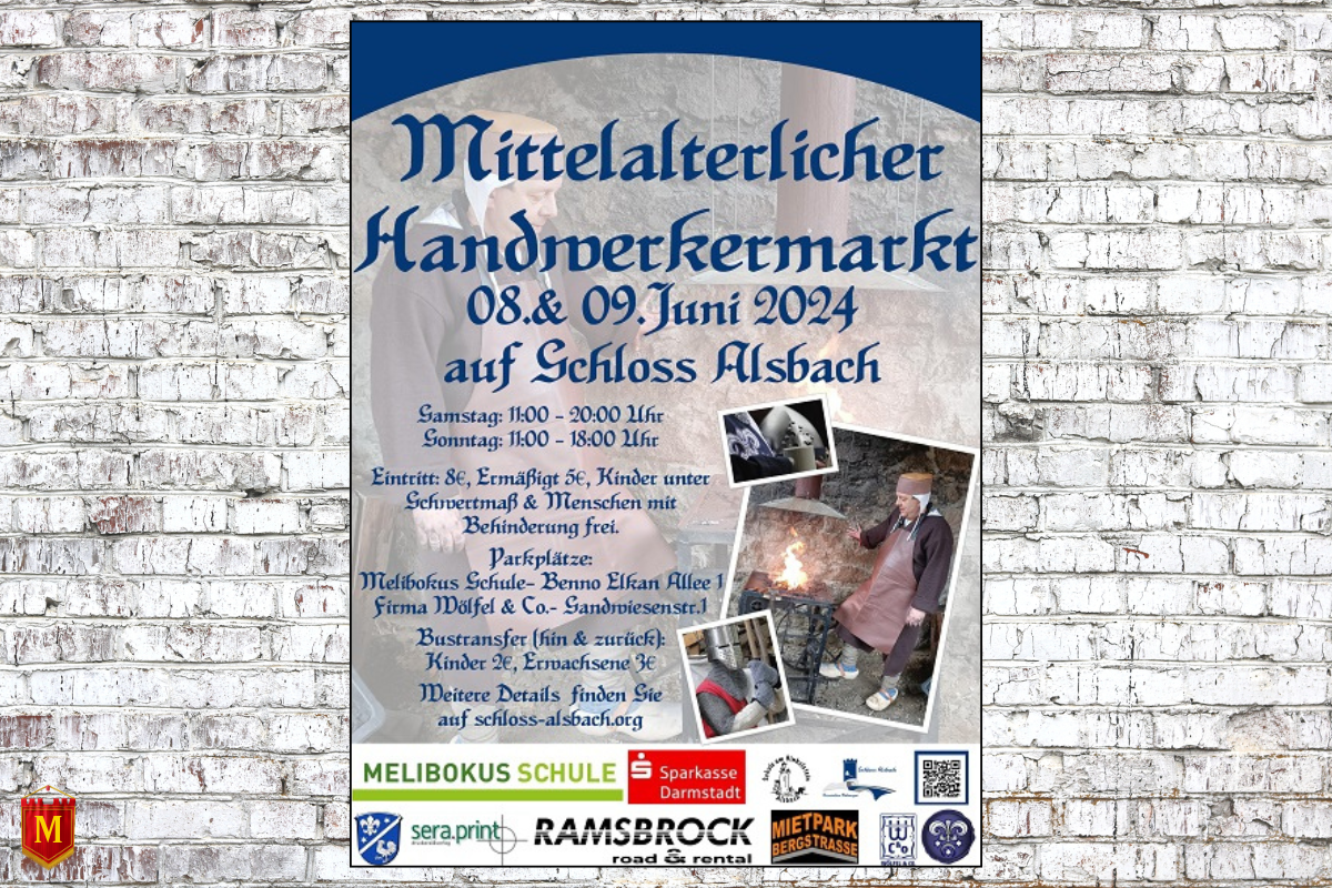 Der Mittelalterliche Handwerkermarkt auf Schloss Alsbach findet am 8. – 09. Juni 2024 in Alsbach-Hähnlein statt. Im Schatten der historischen Mauern des Alsbacher Schlosses entsteht einmal mehr ein lebendiges Spektakel, das Besucher in die Welt des Mittelalters entführt.
