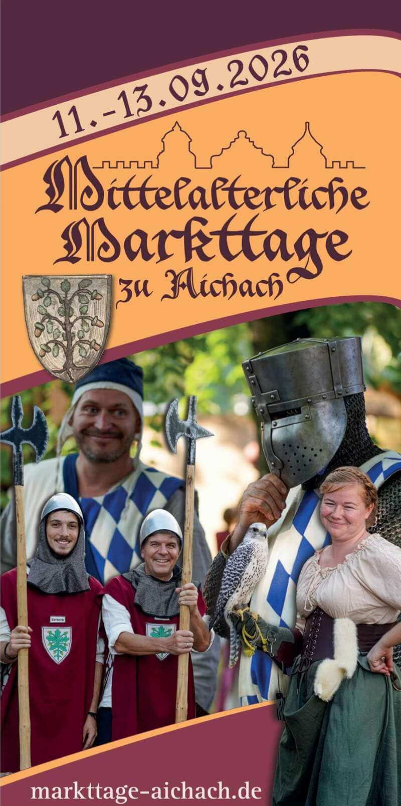 Mittelalterliche Markttage zu Aichach 2026 finden vom 11. bis 13. September 2026 in der Altstadt / Innenstadt von Aichach, Bayern, Deutschland statt. Drei Tage lang wird das Zentrum der Stadt zur Bühne für lebendiges Markttreiben, Lagerleben und ein umfangreiches Programm rund um das Mittelalter.