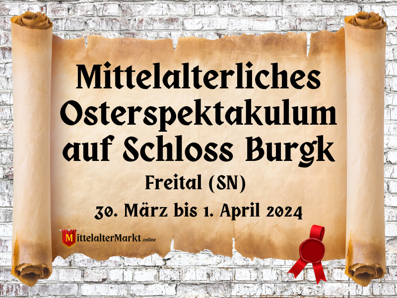 Das Mittelalterliche Osterspektakulum auf Schloss Burgk in Freital, Sachsen (SN) findet vom 30. März bis 1. April 2024 statt. Organisiert wird die Veranstaltung vom Mittelalter Spectaculum. Dieses traditionelle Fest bietet eine einzigartige Gelegenheit, in die Vergangenheit einzutauchen. Besucher können Ritter, Edelfrauen, Gaukler, Musikanten und Sänger in Aktion sehen. Handwerker demonstrieren ihre Fähigkeiten und bieten ihre Waren zum Verkauf an. Für Unterhaltung sorgen Ritterturniere und Gaukler, sowie zahlreiche Mitmachaktionen für Kinder.