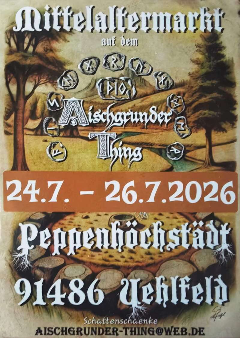 Der Mittelaltermarkt auf dem Aischgrunder Thing 2026 findet vom 24. bis 26. Juli 2026 in Peppenhöchstädt, einem Ortsteil von Uehlfeld, Bayern, Deutschland statt. Drei Tage lang wird das Gelände zum Treffpunkt für alle, die tief in die mystische und kämpferische Welt des frühen Mittelalters eintauchen möchten.