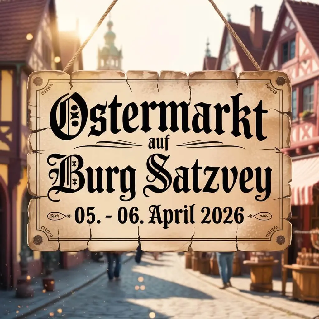 Am 5. und 6. April 2026 lädt die Burg Satzvey in Mechernich-Satzvey in Nordrhein-Westfalen zum Ostermarkt 2026 ein. Der Markt findet am Ostersonntag und Ostermontag jeweils von 12 bis 19 Uhr statt. Auf der offiziellen Veranstaltungsseite sind unter anderem Einlass ab 12 Uhr, die Eiersuche von 13 bis 17 Uhr sowie Marktende um 19 Uhr angegeben.