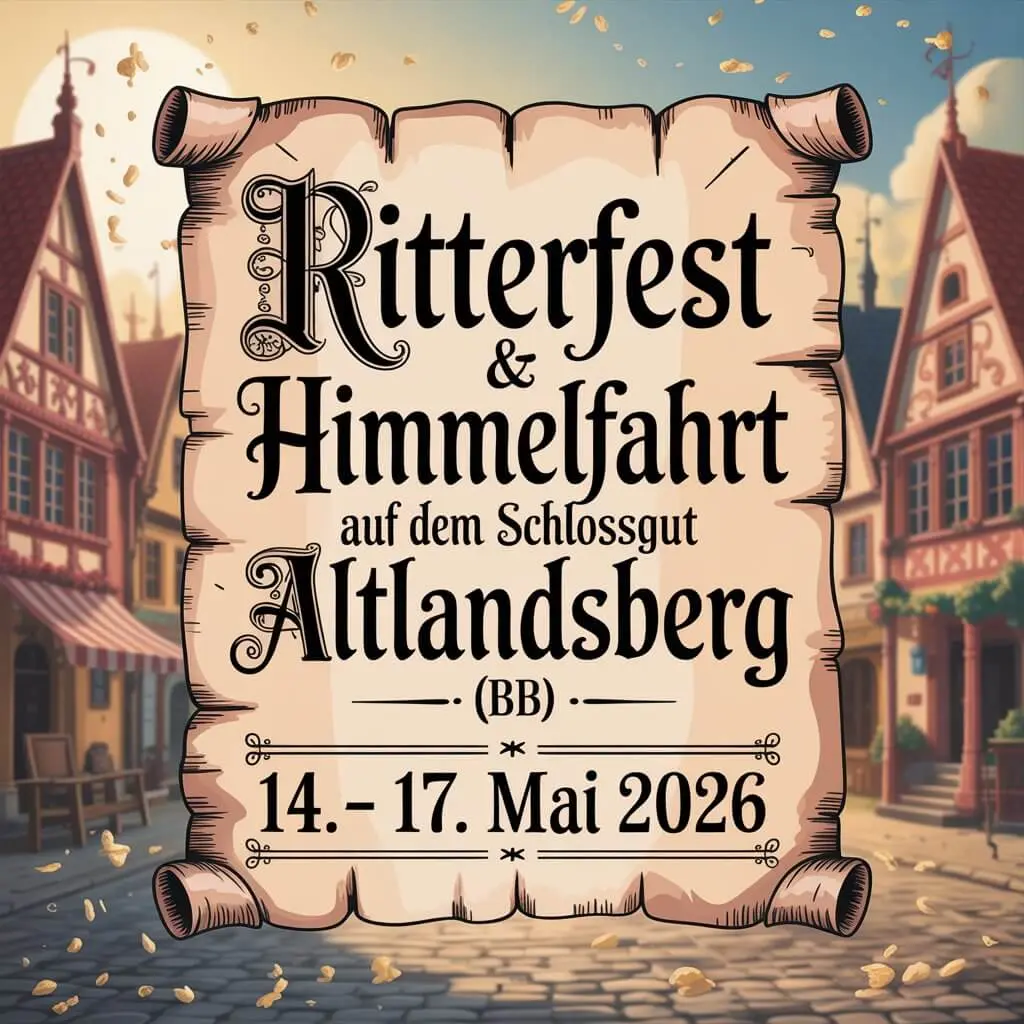 Das Ritterfest & Himmelfahrt auf dem Schlossgut Altlandsberg findet vom 14. bis 17. Mai 2026 in Altlandsberg statt. An vier Tagen stehen Ritterkämpfe, Handwerk & Handel, Mitmachaktionen und ein abwechslungsreiches Bühnenprogramm auf dem Plan.