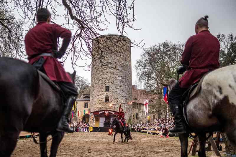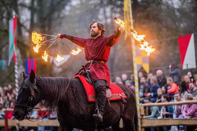 Ritter und Pferde zeigen dabei ihr Können in eindrucksvollen Darbietungen. Besonders spektakulär ist die Trick-Reitershow um 17 Uhr, wenn Mut, Vertrauen und perfekte Abstimmung zwischen Mensch und Tier gefragt sind. Rasante Stunts und eindrucksvolle Reitkunst sorgen hier regelmäßig für staunende Zuschauer.