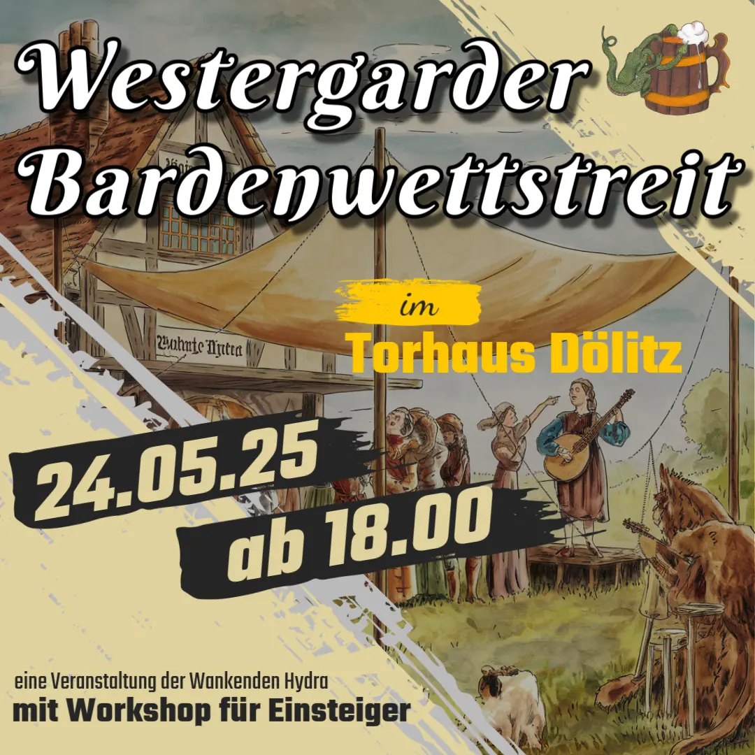 Ein legendärer Wettstreit kehrt zurück! Am 24. Mai 2025 verwandelt sich das Torhaus Dölitz in Leipzig in eine Bühne für Musiker, Poeten und Barden. Sei dabei, wenn alte Traditionen zu neuem Leben erweckt werden und sich Künstler aus Nah und Fern dem Wettbewerb stellen.