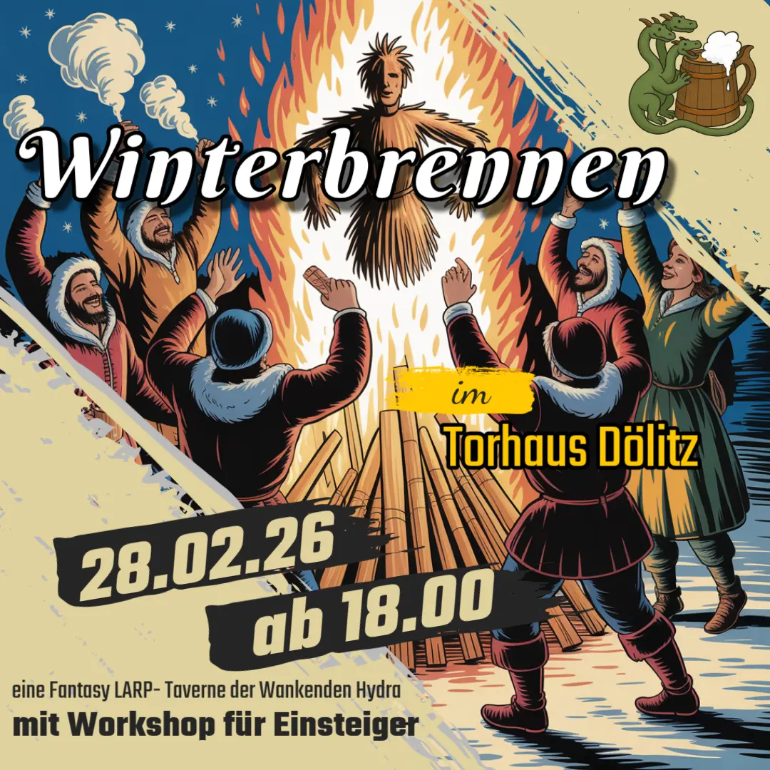 Am 28. Februar 2026 wird es in Sachsen richtig gemütlich und mystisch zugleich, wenn in Leipzig das „Winterbrennen“ – ein Fantasy Tavernenabend 2026 stattfindet. Während der Winter draußen noch versucht, alles fest im Griff zu halten, kommen wir zusammen, um die Geister der kalten Jahreszeit mit Lärm, Feuer und einer starken Gemeinschaft endgültig zu vertreiben. Die Fantasy-LARP-Taverne „Die Wankende Hydra“ lädt euch zu diesem besonderen Abend direkt ins Torhaus Dölitz ein, um den Winterbold den Flammen zu übergeben und den Frühling gebührend zu begrüßen.